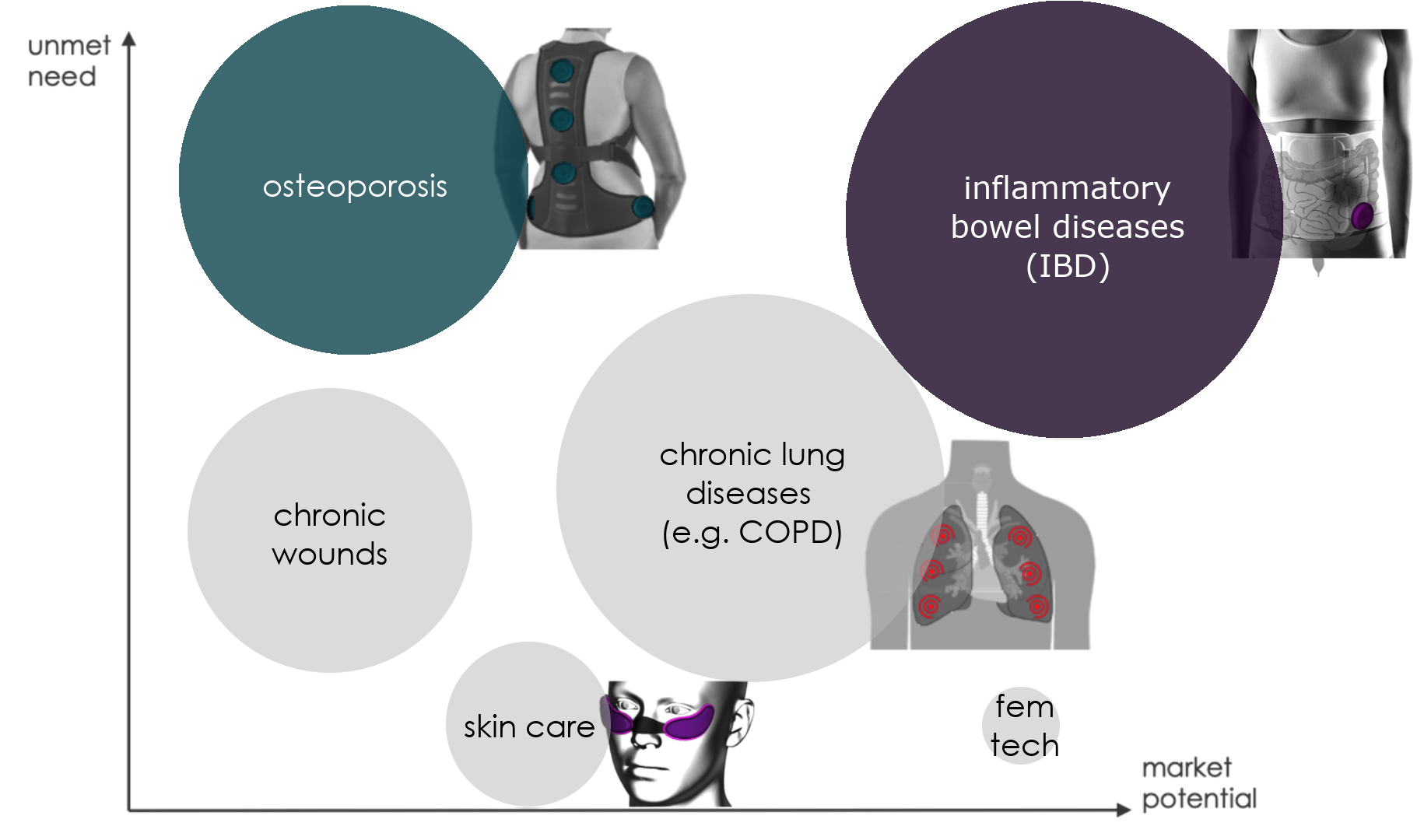 Based on research findings and technological capabilities, we consider the following monitoring and treatment goals. The medical needs are clearly defined and chronic in nature. In addition, current medications are often not suitable for long-term use.